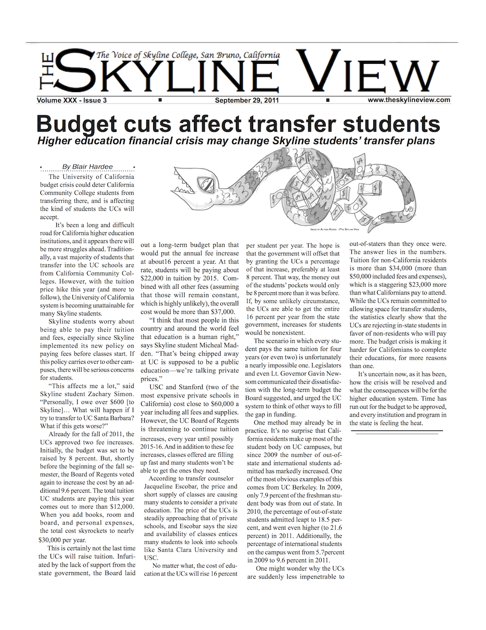 Budget cuts affect transfer students Front-page news article, The Skyline View September 2011 Share this: Click to share on X (Opens in new window) X Click to share on Facebook (Opens in new window) Facebook Like Loading...